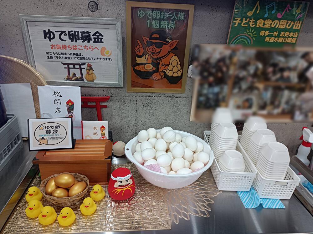 ゆで卵の隣りには「ゆで卵募金」と書かれた張り紙と募金箱がありました。志免本店では、毎週木曜日に「子ども食堂」を開催されており、集まった募金は子ども食堂で使われるそうです。気持ちが良い取り組みだと感じました。