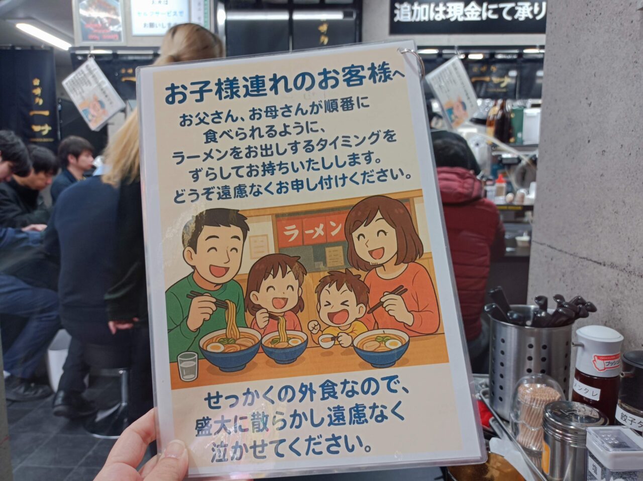 汁が衣類に飛ばないように紙ナプキンなどを提供してくれるほか、ラーメンを出すタイミングを相談すれば、お父さんもお母さんもゆっくりラーメンを堪能できますよ。家族や友人、ひとりでも気兼ねなく足を運べるのはうれしいですね。