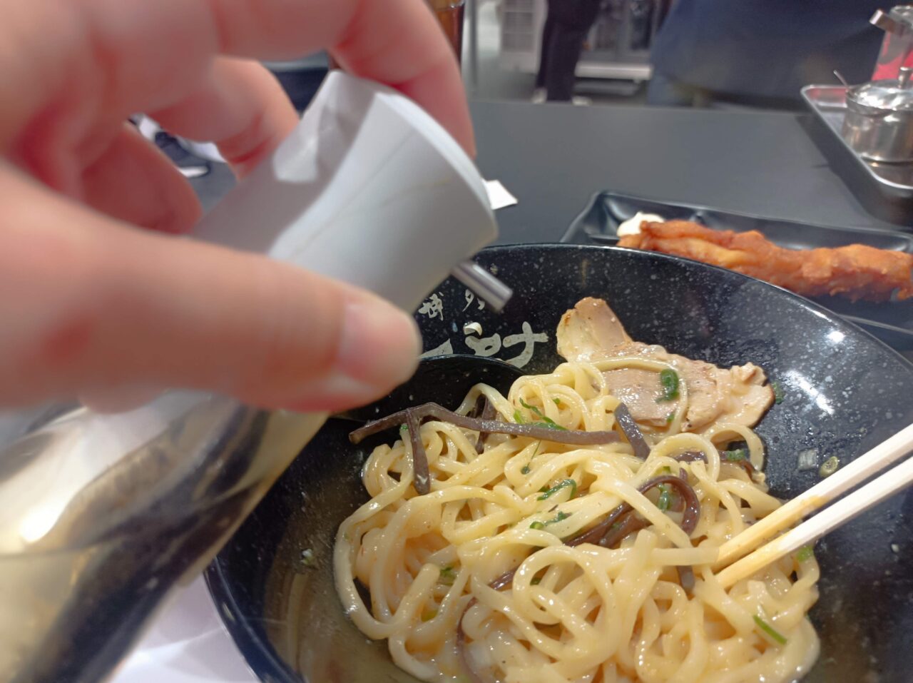 麺を食べ終えたら、ミニライスを投入。混ぜると魚介風リゾットに早変わりします。タレがご飯によく絡み、ボリュームはありつつも重すぎず、最後まで飽きずに楽しめました。