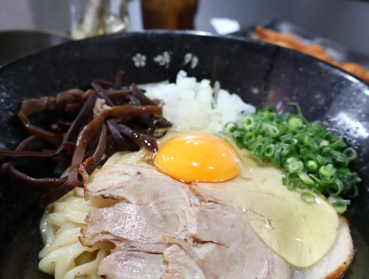 まぜそばの麺はモチモチの平打ち麺。上にはチャーシュー、きくらげ、玉ねぎ、小ねぎ、生卵がのっており、食欲をそそります。