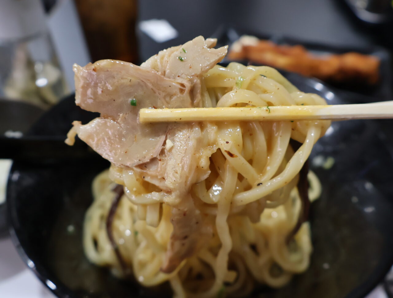 魚介ダシの効いたタレと油、麺、具を混ぜていただくと、魚介のいい香りがふあっと広がります。一口食べると、麺のモチモチ感ときくらげのコリコリ感、玉ねぎのシャキシャキ感と、様々な食感が楽しめます。混ぜれば混ぜるほど麺にタレがしっかり絡み、これが癖になるおいしさです。