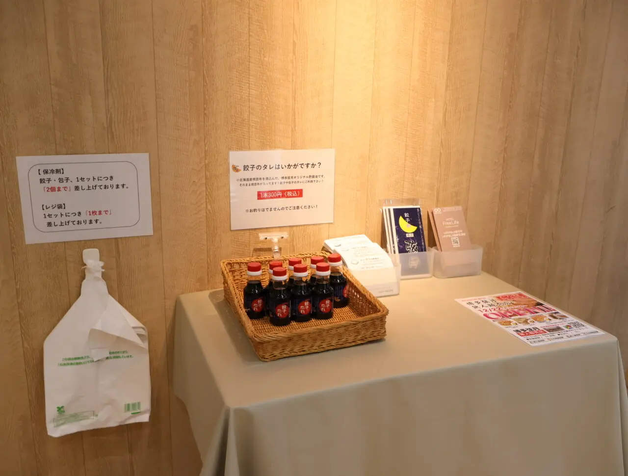 1セット購入につき保冷材は2個まで、レジ袋が1枚無料なので、急に「今夜は餃子にしよう!」と思いついて立ち寄っても、安心して持ち帰ることができます。