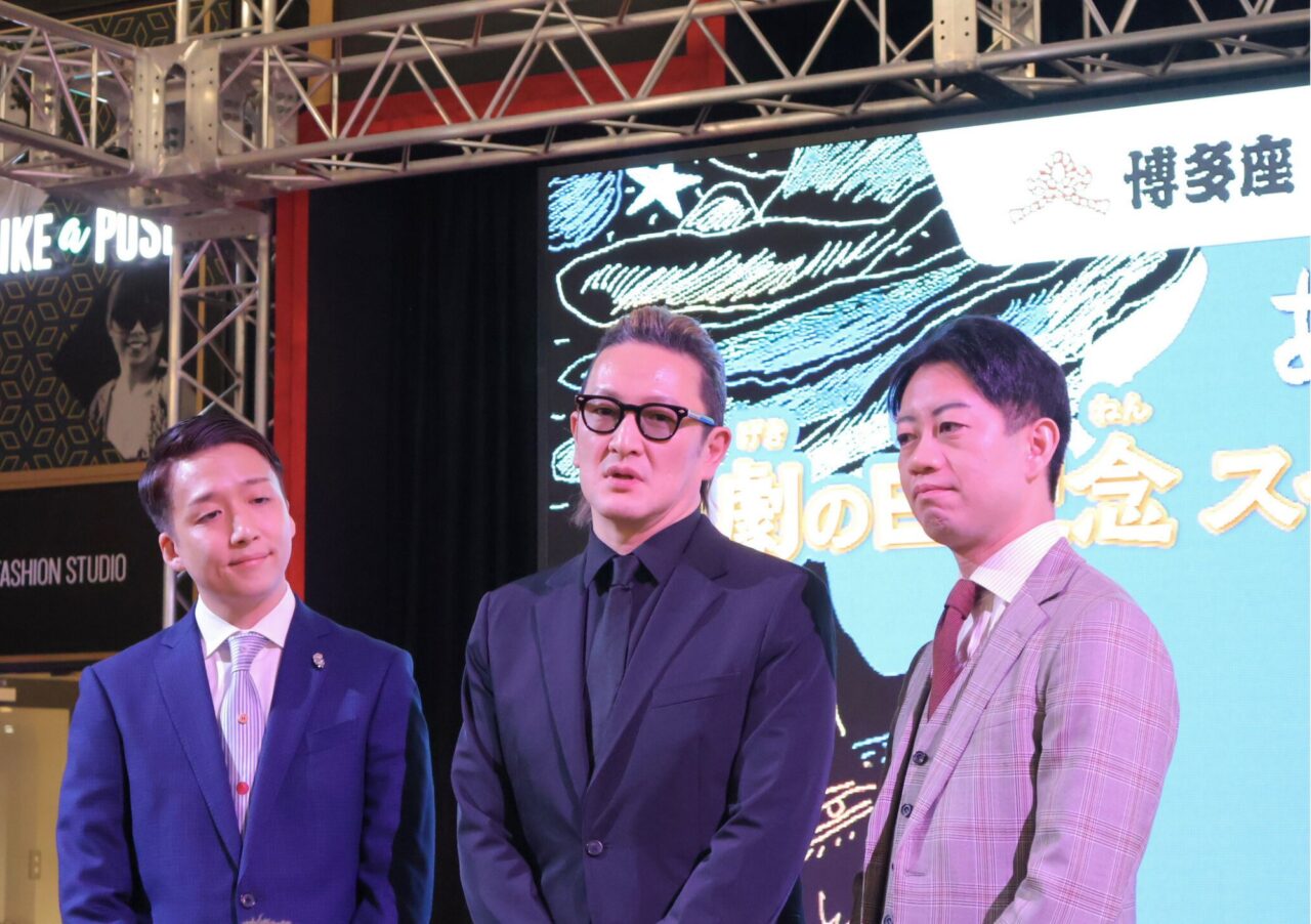 現在博多座で上演中の二月花形歌舞伎『あらしのよるに』に出演の中村獅童さん、中村壱太郎さん、中村米吉さん、そして「あらしのよるに」原作者のきむらゆういち先生、作画のあべ弘士先生という、豪華な顔ぶれが登壇すると会場からは大きな拍手が起こりました。