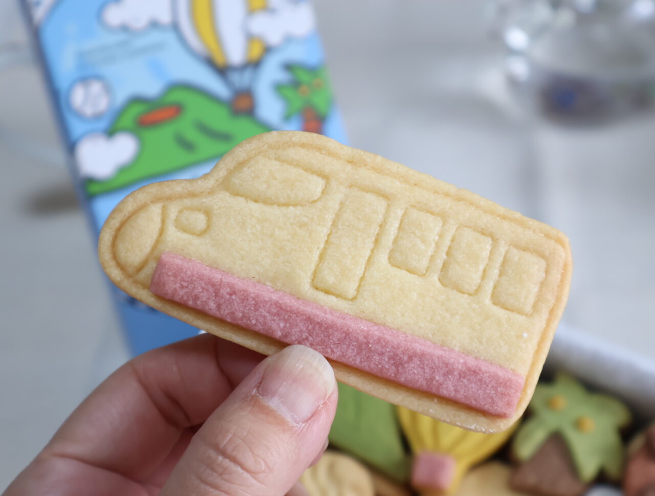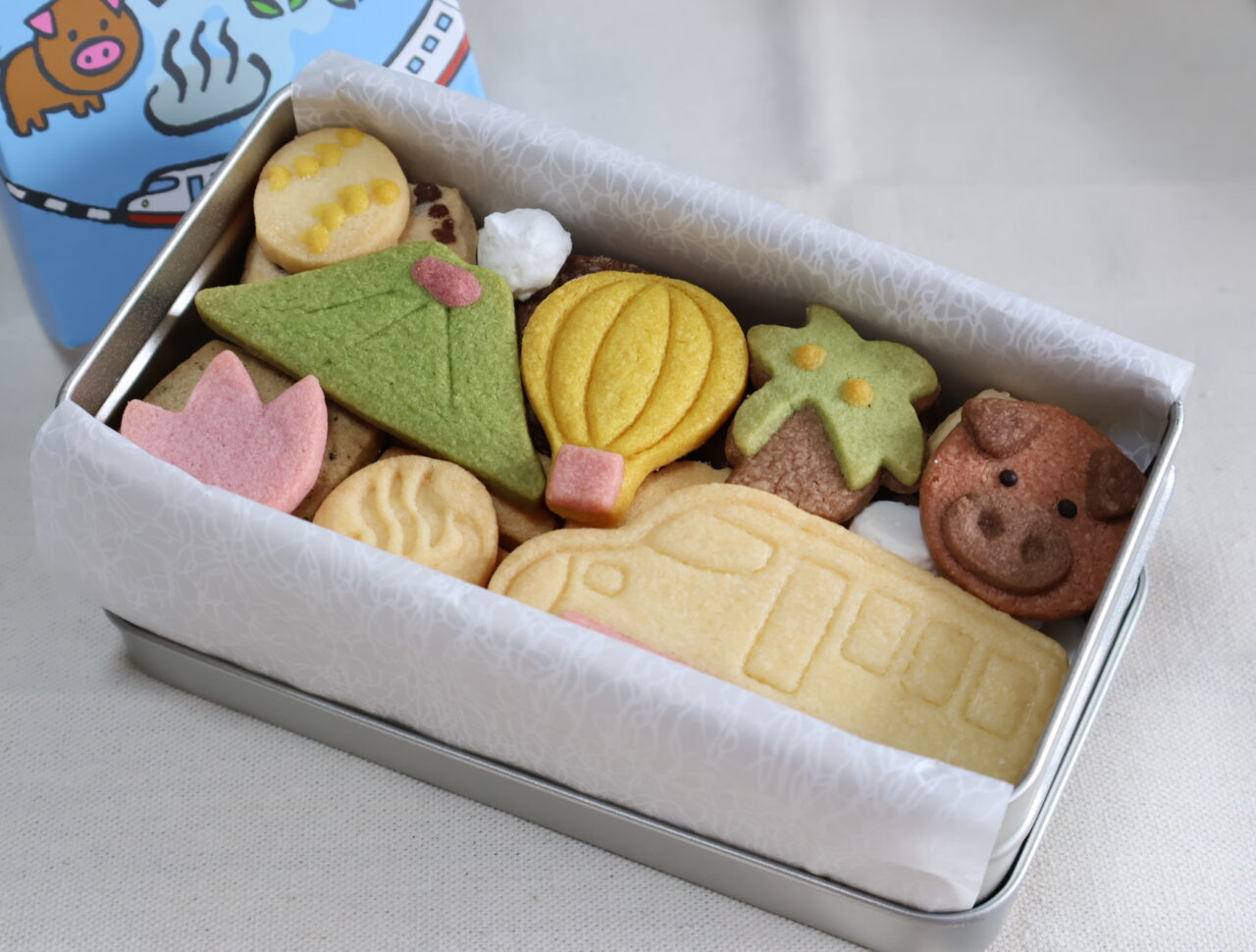 「旅する九州クッキー缶」の蓋を開けてみると、思わず「わぁ!」と声が出てしまうほどかわいい。インパクト大の列車のクッキーに、スポーツが盛んな福岡をイメージした野球ボール、熊本を代表する阿蘇山、鹿児島・西郷隆盛も愛した黒豚など、食べるのがもったいないクッキーが詰まっています。