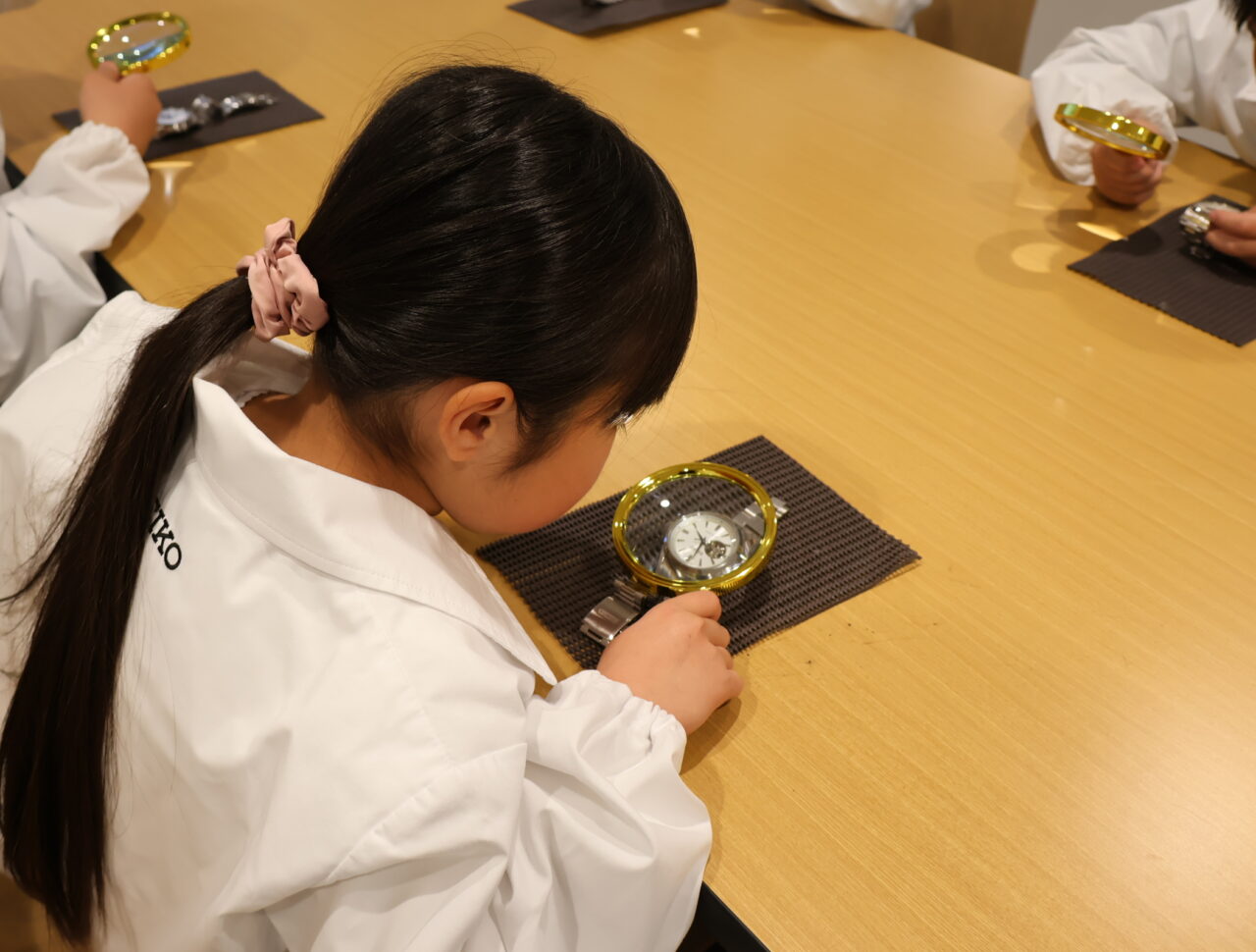 時計の歴史を学んだ後、ルーペを使って本物の機械式時計の動きを観察。「時計の中には160個以上の部品が詰まっているんだよ」というスーパーバイザーの話に、筆者はこどもたち以上に驚いてしまいました。製品によっては300個を超えることもあるそうで、緻密に作られている腕時計に、こどもたちは興味津々でした!