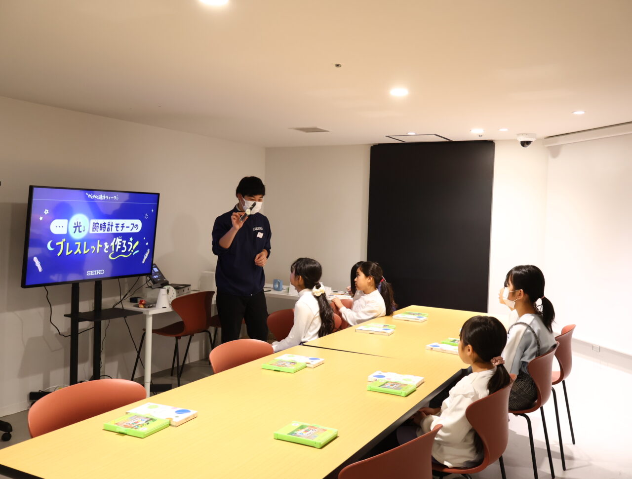 こどもたちは、時計の歴史と夜の時計が光る秘密を学んだ後、光る腕時計モチーフのブレスレット作りに挑戦できます。