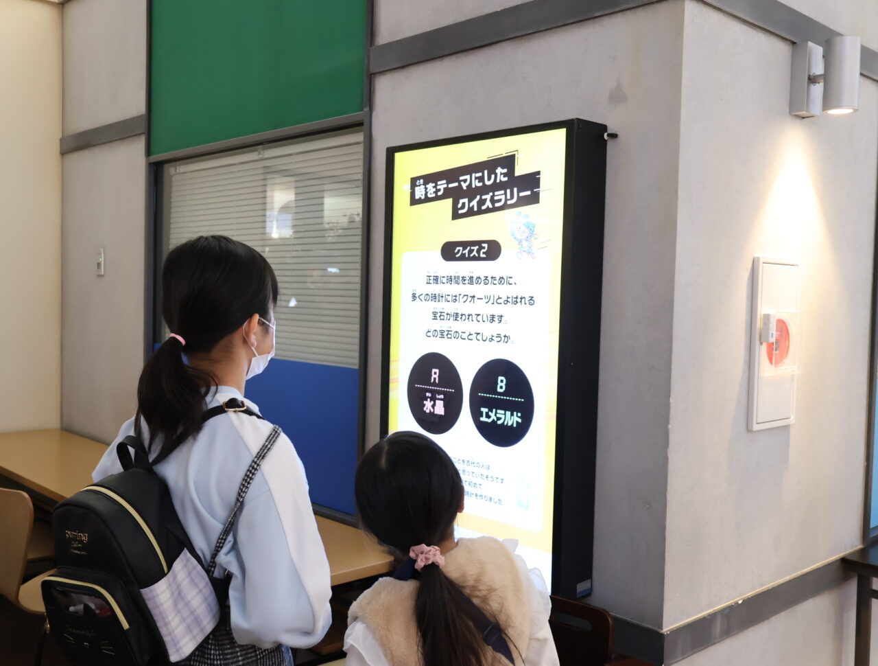 キッザニア福岡の街の中3ヶ所にある時に関するクイズに答えていきます。こどもたちいわく、3問ともワークショップで学んだ内容なんだとか。単に「話を聞く」だけで終わらない、すぐにクイズで復習できるのは、親としてもうれしい仕組みだと感じました。