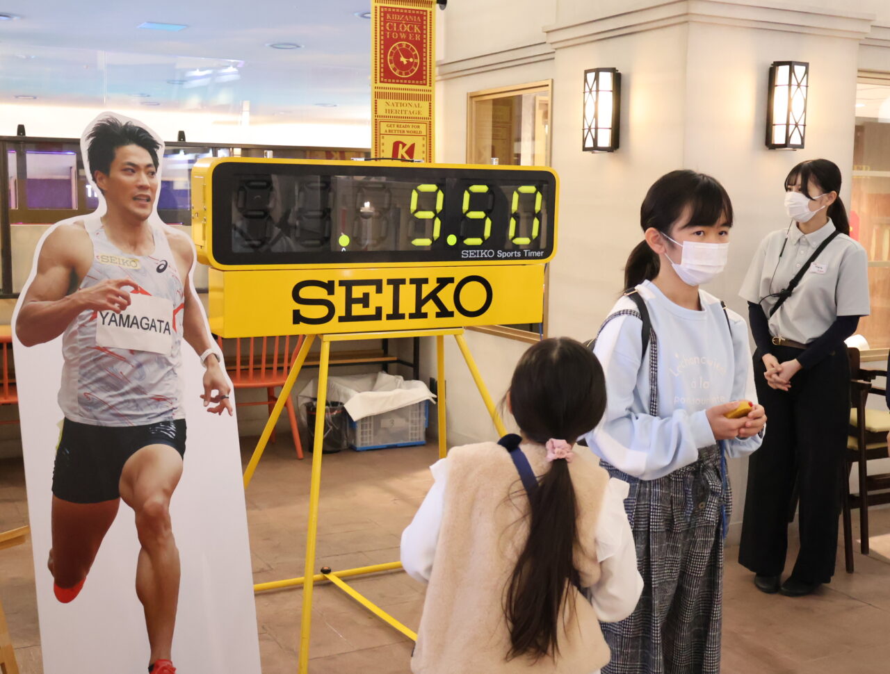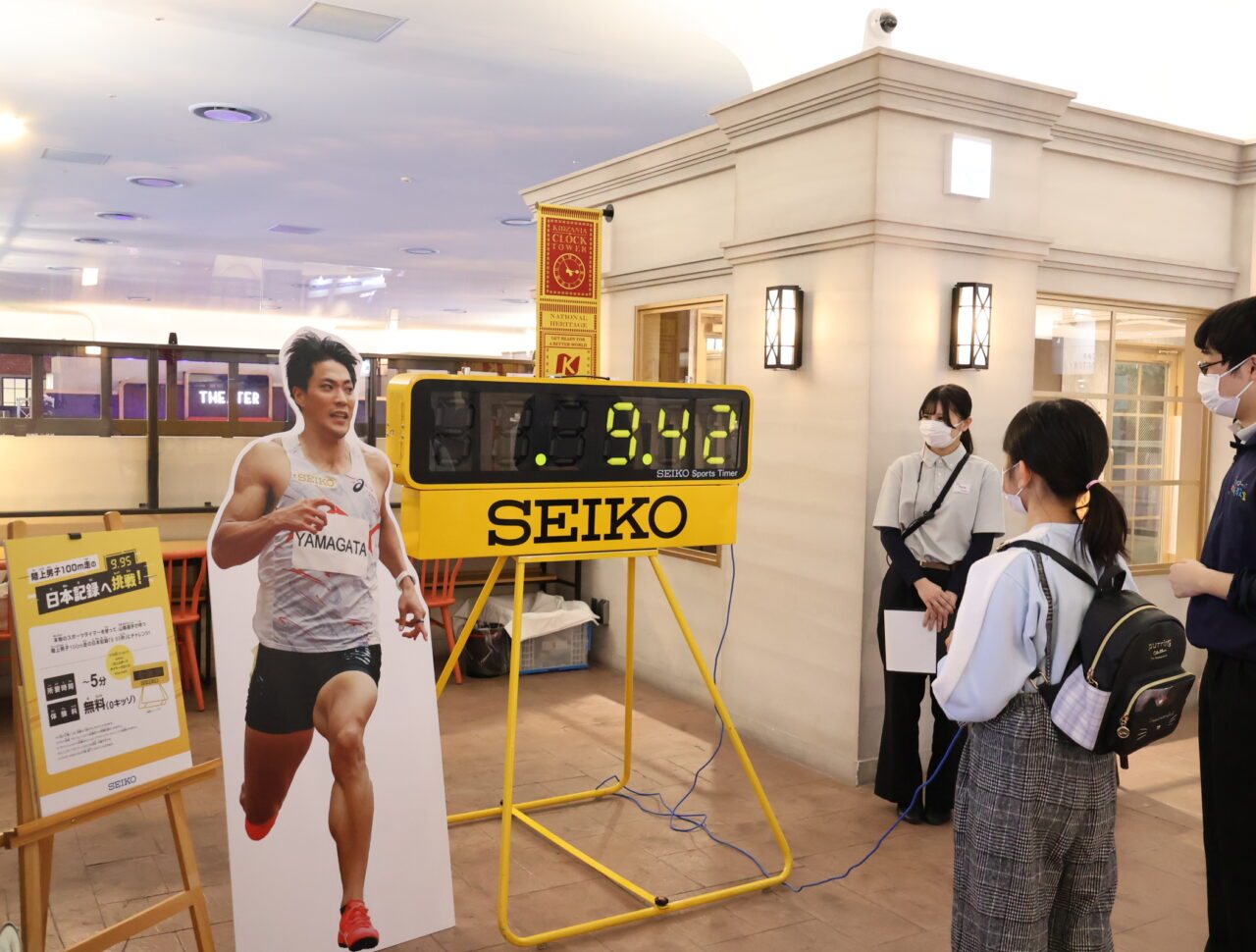 最後に向かったのは、ひときわ目を引く黄色いSEIKOのスポーツタイマーが設置されたコーナー。SEIKO所属の山縣亮太選手が持つ陸上男子100m走の日本記録「9.95秒」を時計を見ずにストップさせるチャレンジです。