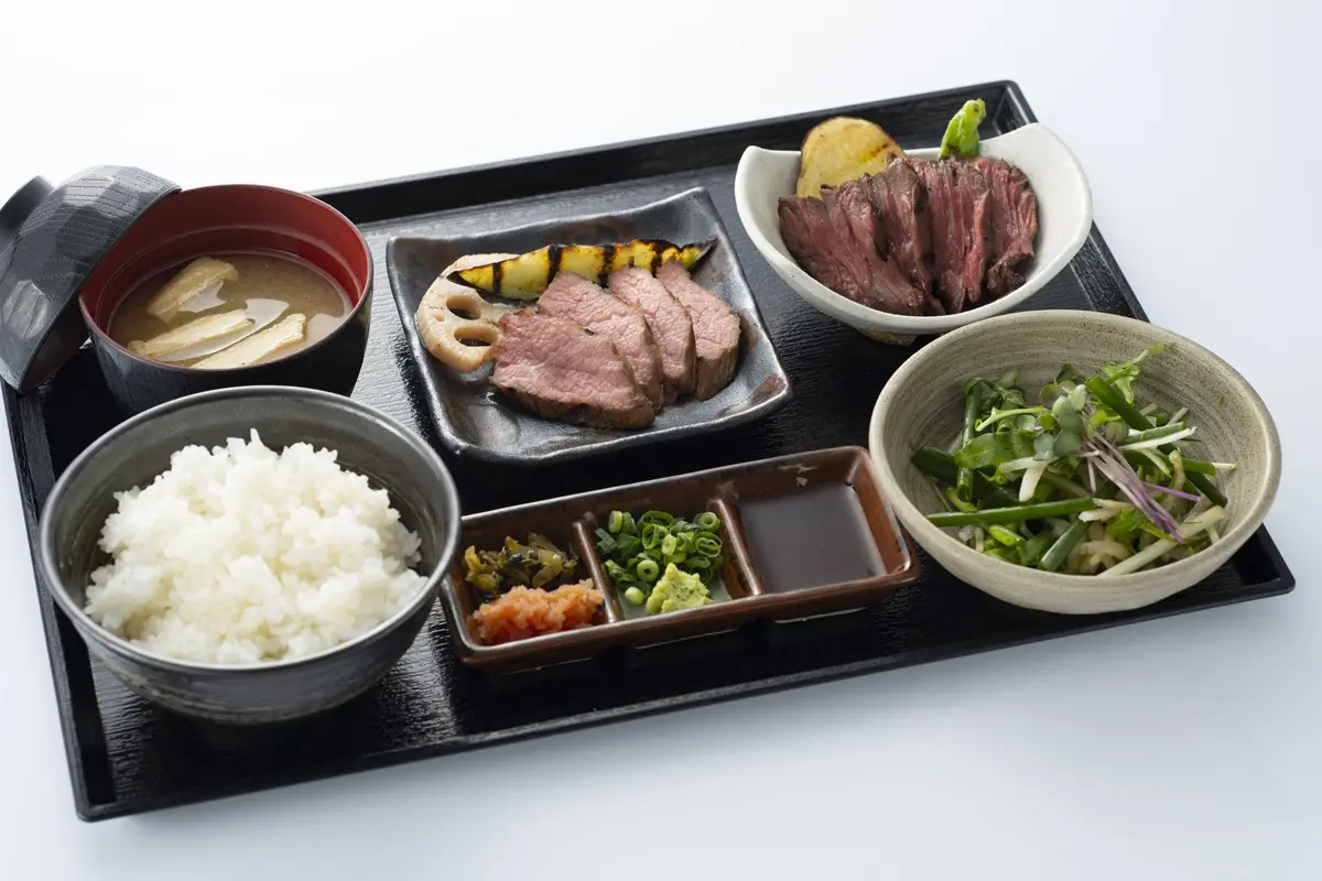 力強い旨みのあか牛とほどける柔らかさのハラミが一度にいただける贅沢な御膳です。