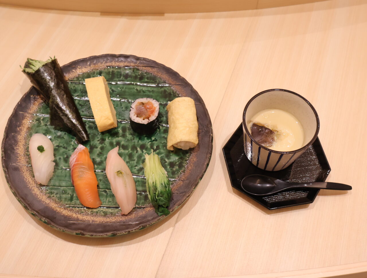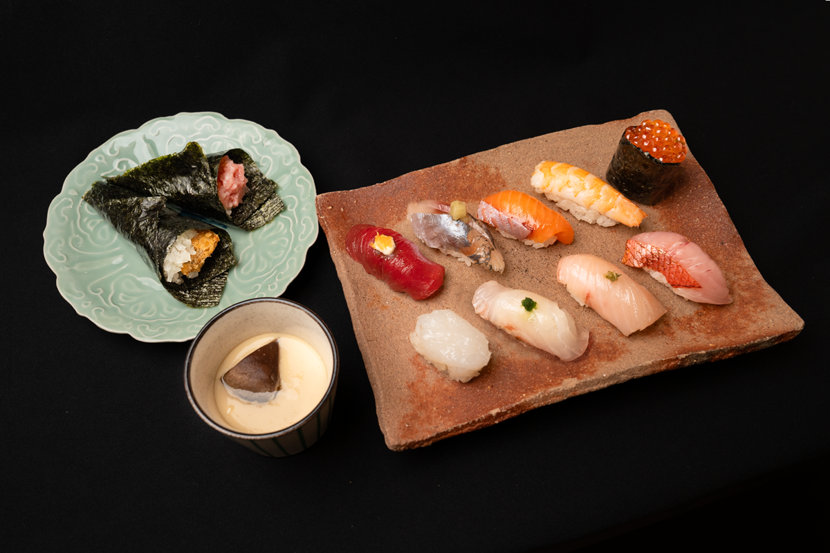 今回いただいた「藤コース」は、その時期に最も美味しい地元の魚介を厳選。シェフの感性が光る極上の握り鮨を中心に、趣向を凝らしたいなりや手巻きなど8貫に茶碗蒸しがついたコースです。