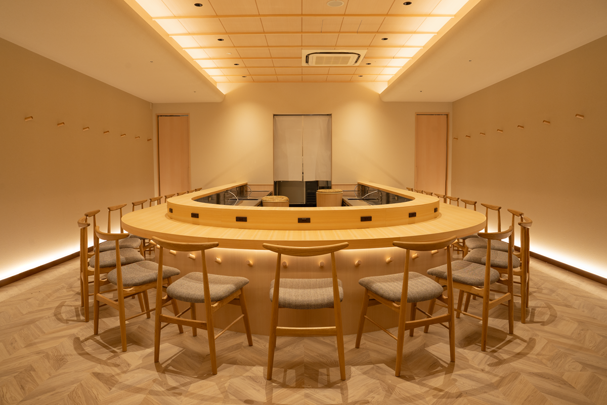 暖簾をくぐると、木のぬくもりを感じる和の空間が広がります。中央には職人の技を間近で楽しめる、U字型のカウンター席となっています。