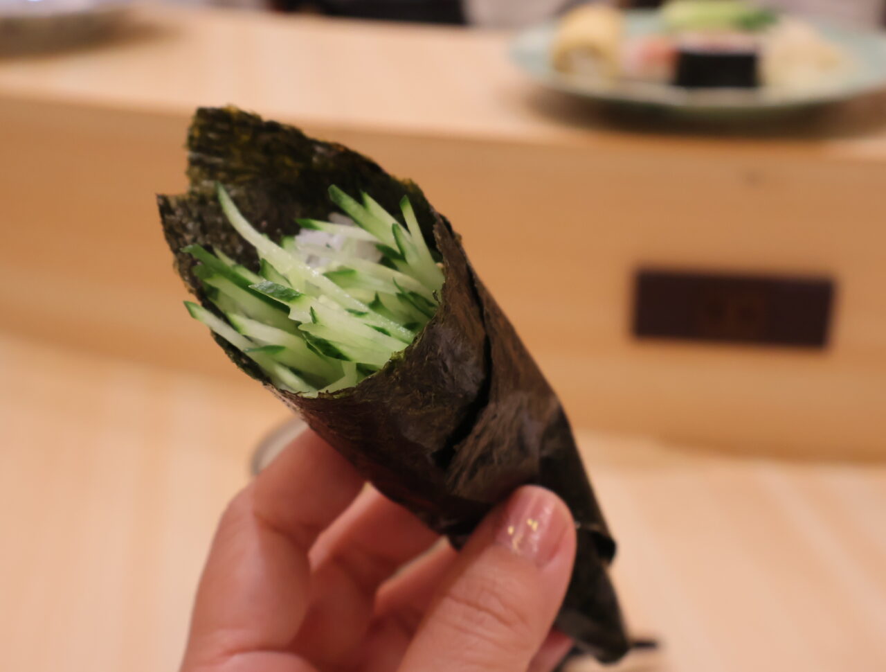「はい。かっぱです。」と手渡しされた手巻きには、千切りされたきゅうりのボリュームに驚かされます。きゅうりのシャキシャキとした瑞々しい食感と、海苔のパリッとした食感は、一度食べたら癖になります。