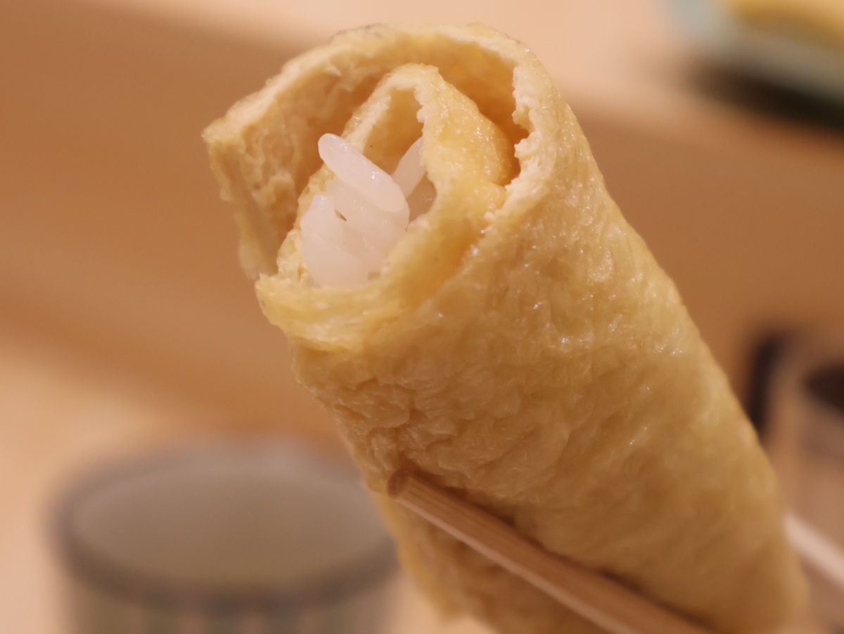 こちらも驚かされたのが「いなり」。一般的な形とは異なり、ご飯を薄いお揚げでくるくると巻いた筒状になっています。甘さを控えた上品な味わいでした。