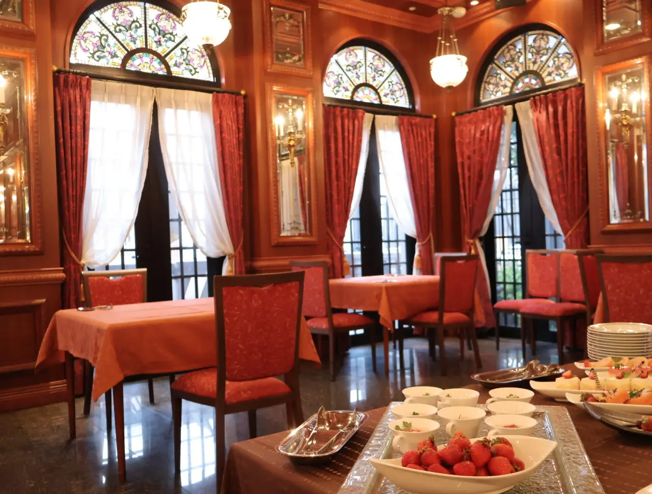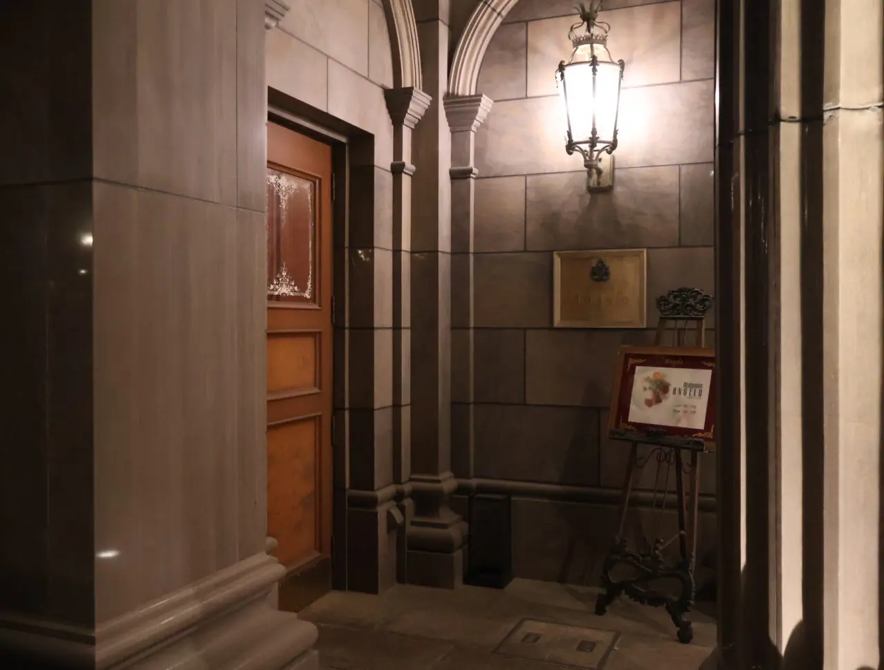 「リストランテ アンジェロ」があるのは、建物の左側。重厚感のある扉を開けると、そこはまるで中世ヨーロッパ。美しい朱色を基調とした店内に、思わず目を奪われます。