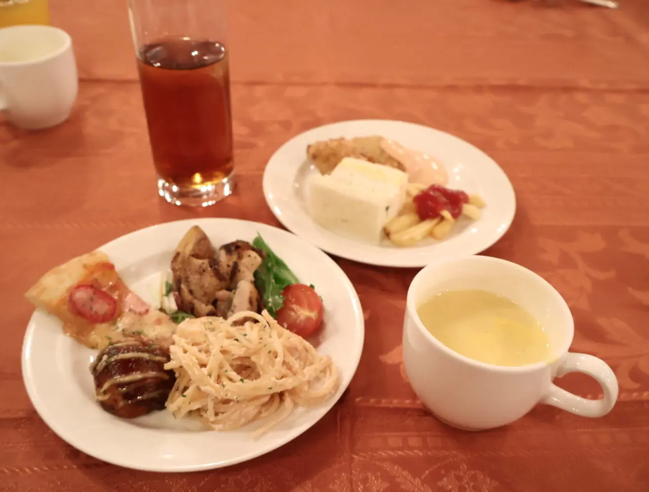 また、コーンスープやアップルジュースやウーロン茶など数種類のソフトドリンクもおかわり自由なのもうれしい。つい何度も足を運んでしまう充実の内容です。