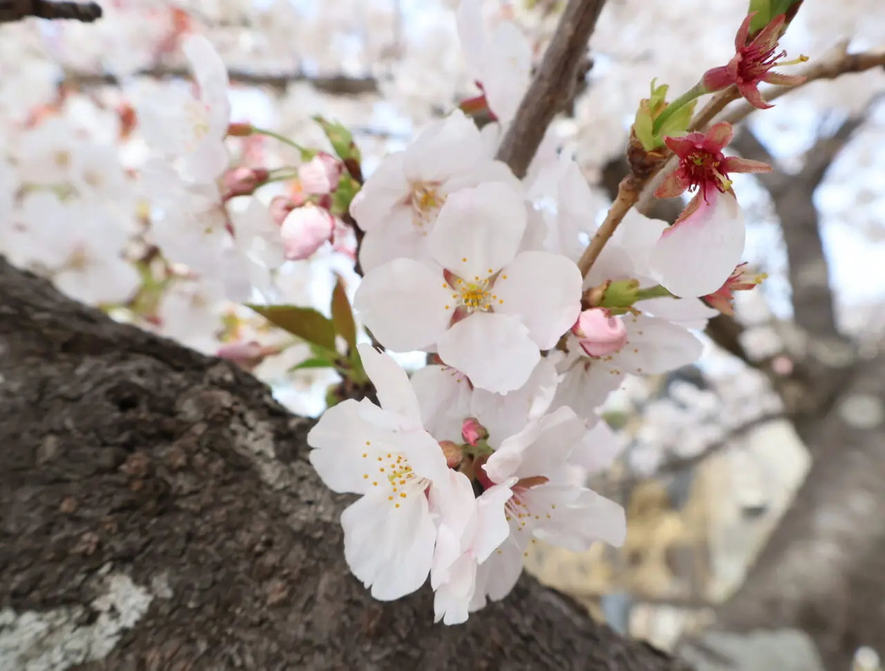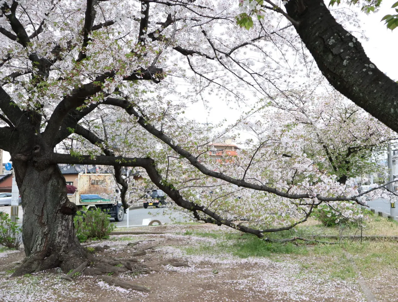 ただ、3月末からの雨風の影響のせいで足元にはすでに多くの花びらが。木によっては、葉桜になっている木もありましたよ。