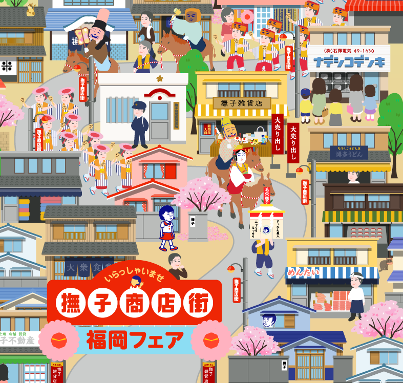 商店街は華やかな博多どんたくで賑わい、神社の露店には、明太子やあまおうなど福岡名物がずらり!『あっ!ココも福岡!』というポイントがたくさんですよ。ぜひチェックしてくださいね。