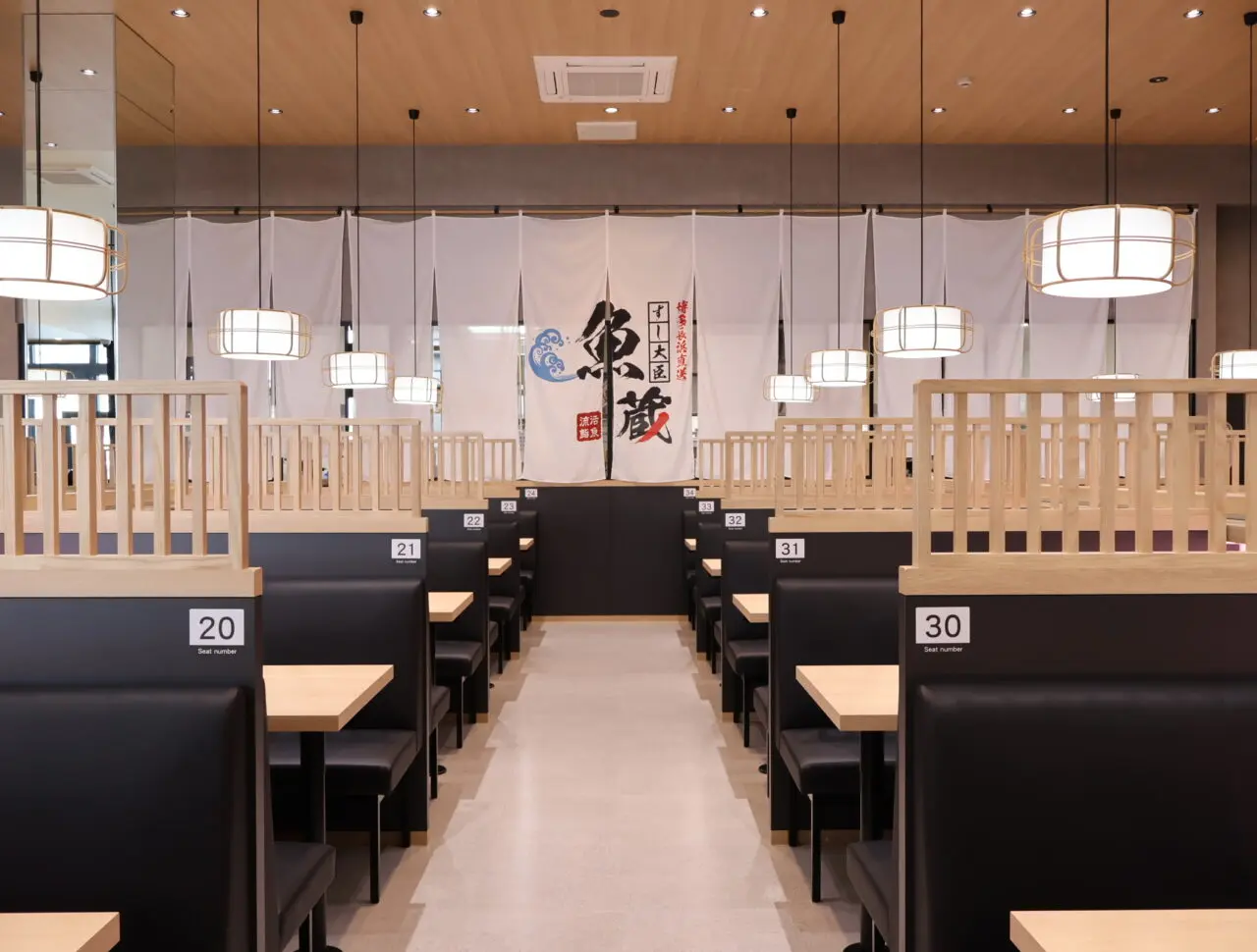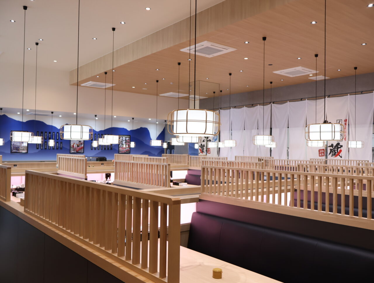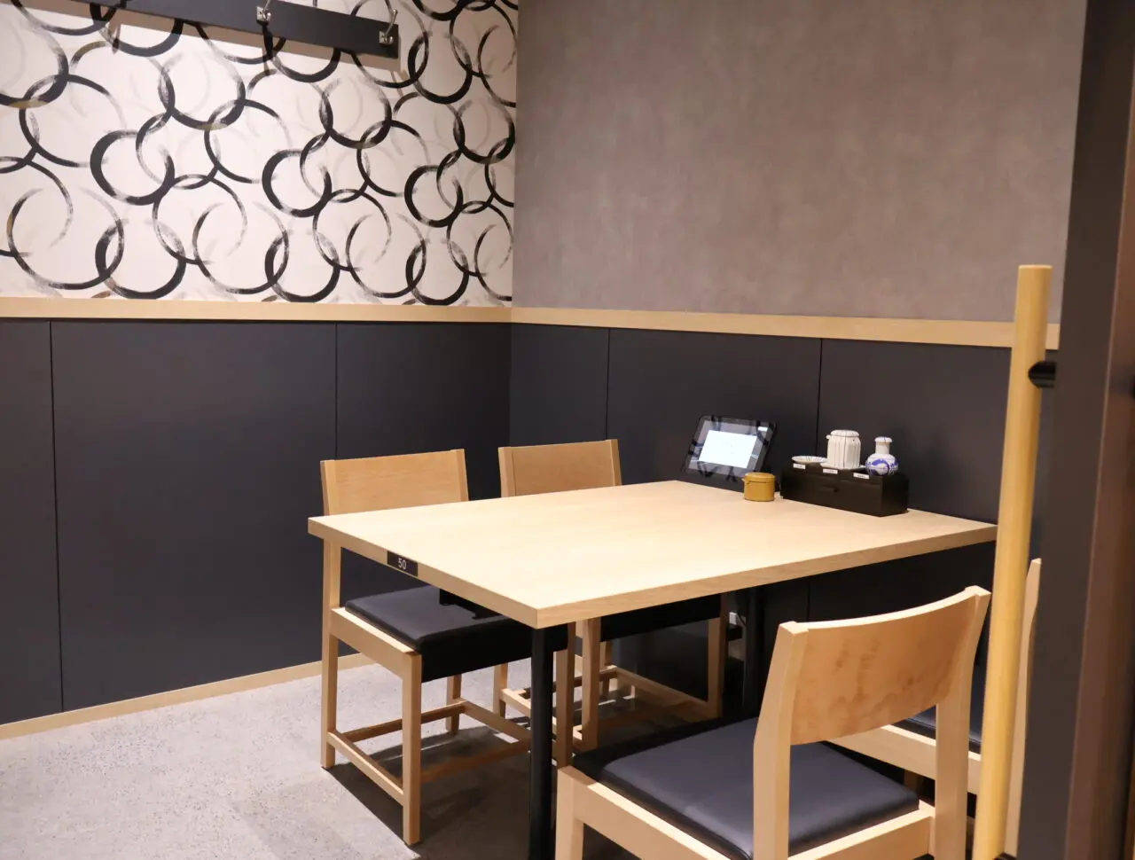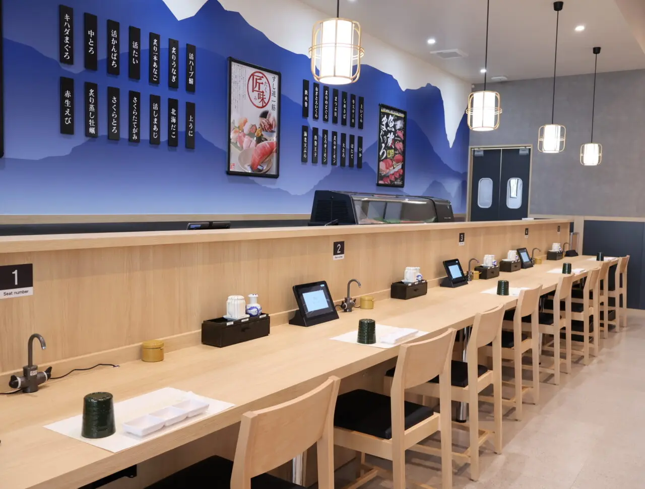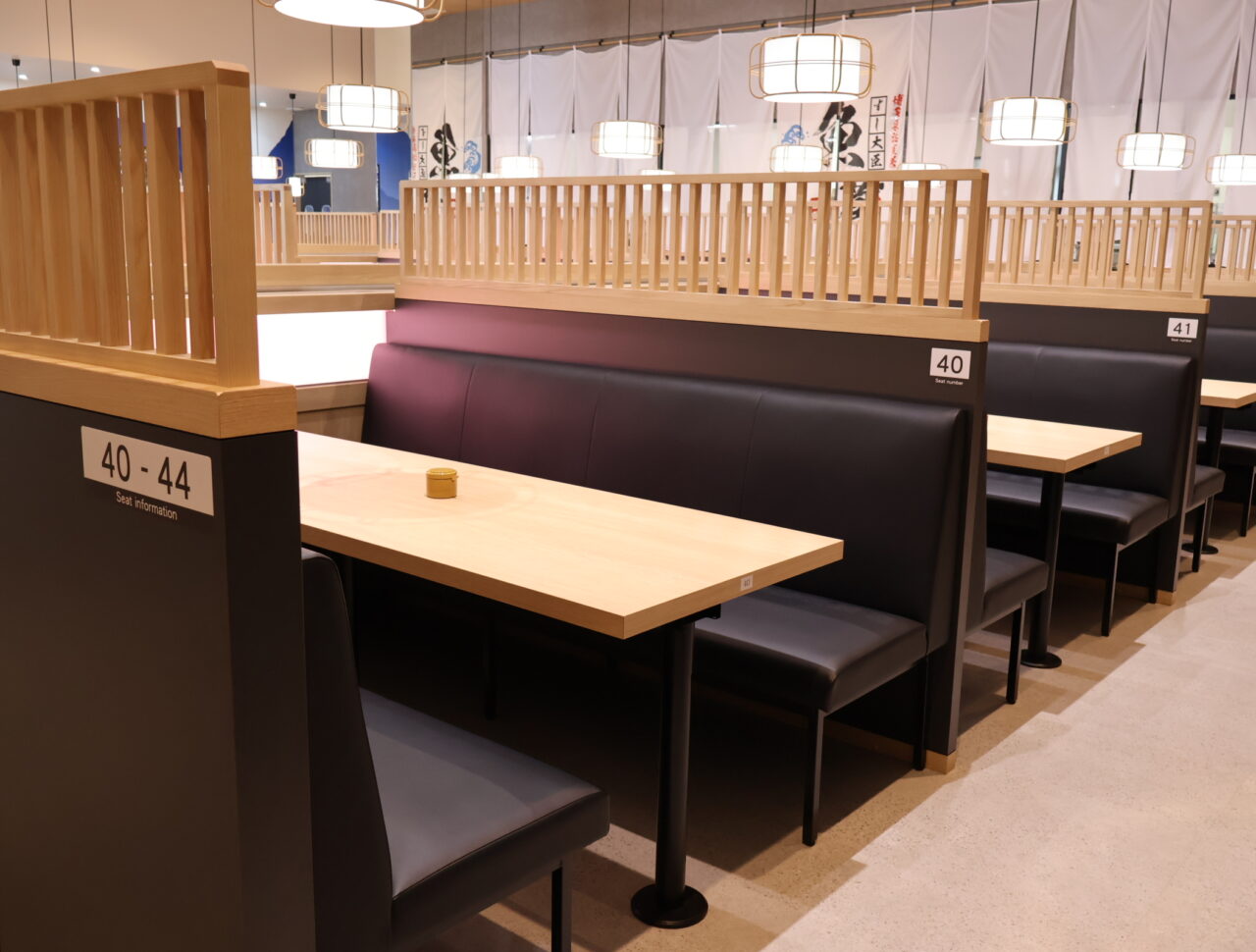 ゆっくりと、新鮮なお寿司などを召し上がっていただきたいという想いから、他の回転寿司店では珍しい「8人掛け」の広々としたテーブル席が並びます。一般的なボックス席よりもゆとりがあるため、大人数での利用はもちろん、小さなお子様連れでも落ち着いて食事を楽しめます。