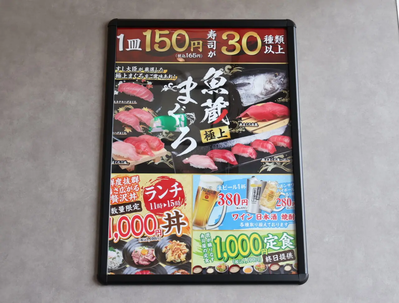「すし大臣 魚蔵 板付店」は、厳選した極上まぐろや期間限定の絶品ネタに加え、1皿150円(税込165円)寿司が30種類以上も揃います。絶品の寿司がリーズナブルにいただけるだけでなく、な!なんと生ビールが1杯380円(税込418円)という驚きの値段設定。
