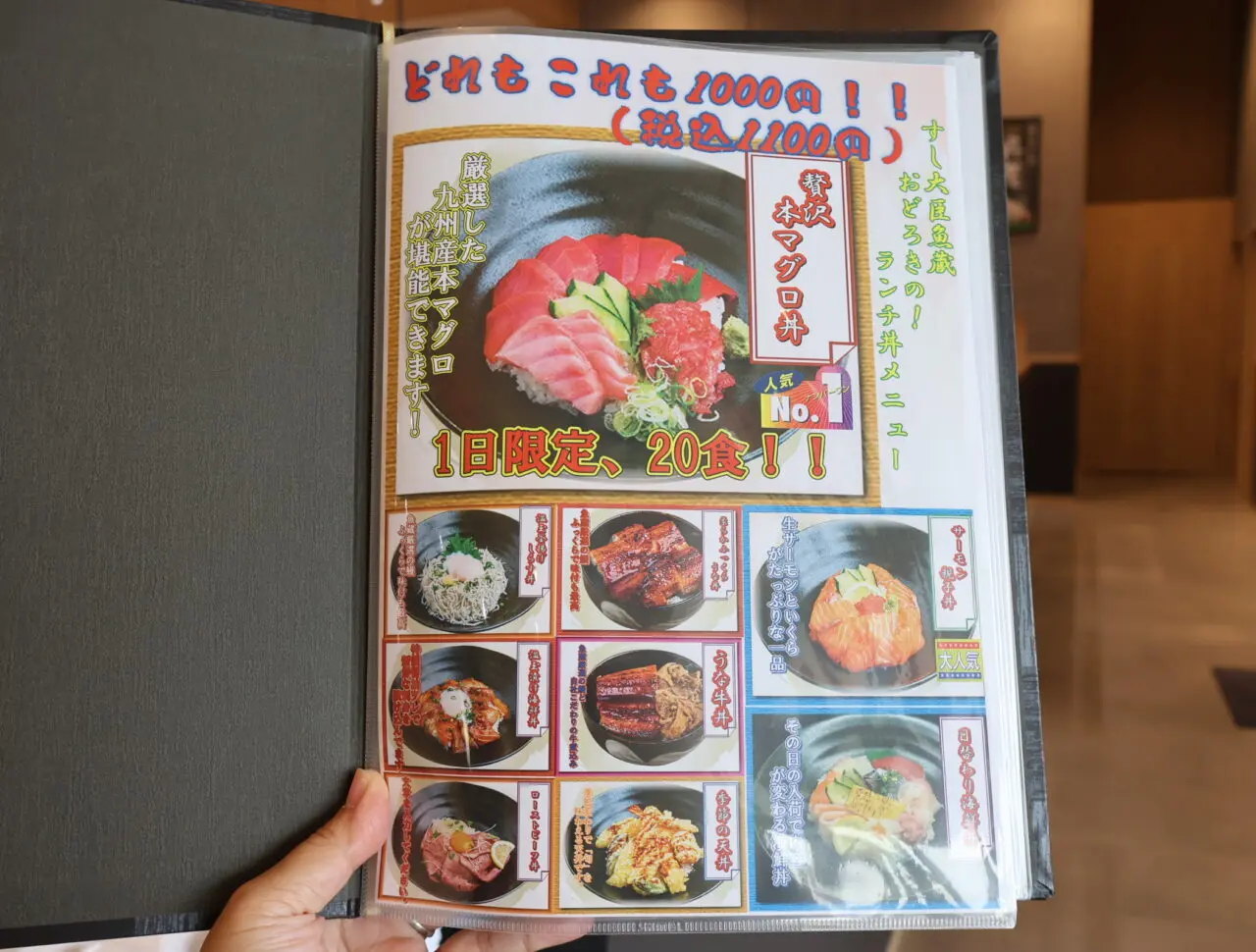 ランチタイム限定の丼物は、9種類が全て1,000円(税込1,100円)。厳選した九州産本マグロを贅沢に使った人気No.1の「贅沢本マグロ丼」をはじめ、その日の仕入れによって内容が変わる「日替わり海鮮丼」、旬の味を味わえる「季節の天丼」があり、どれにするか悩んでしまいそうです。