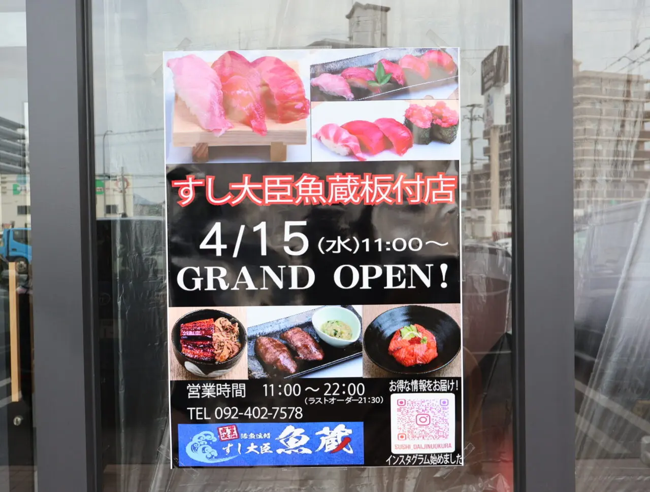 本日(2026年4月15日(水))11時に「すし大臣 魚蔵 板付店」がオープンします!
