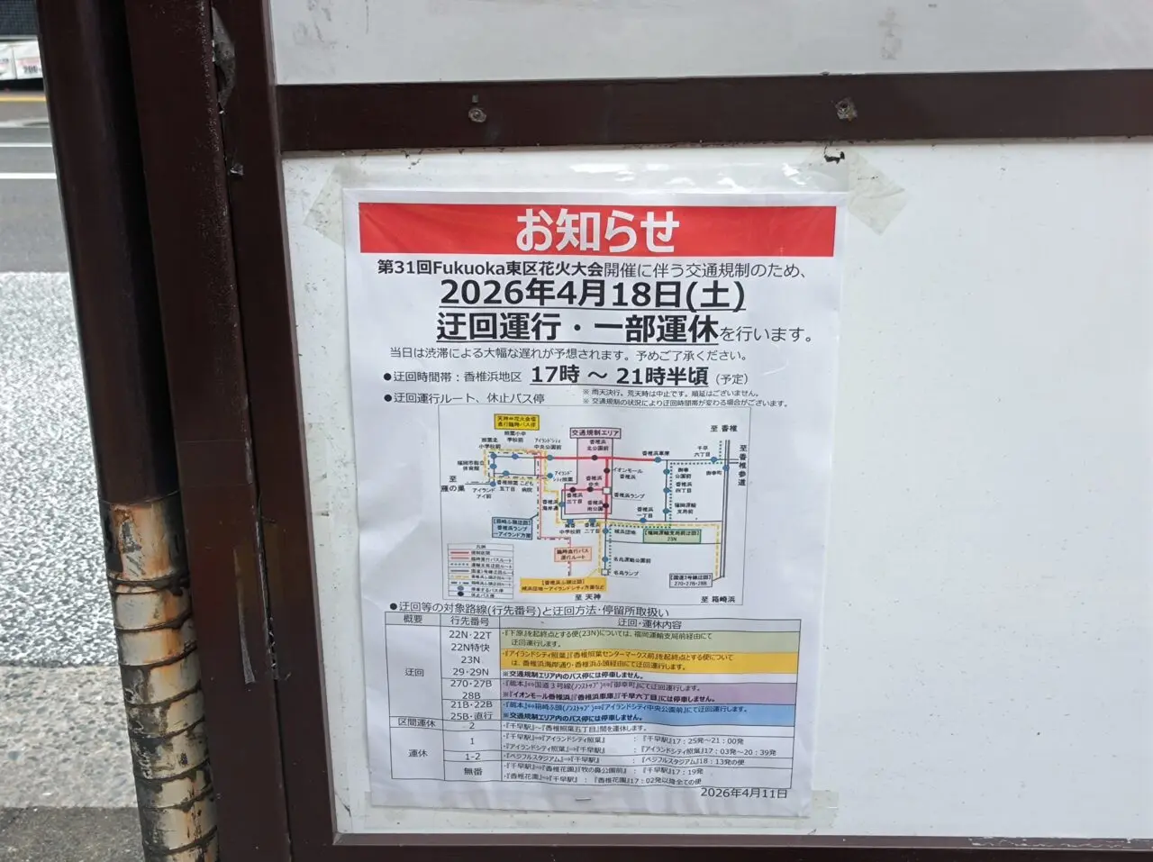 「第31回Fukuoka東区花火大会」開催に伴い、花火大会開催時間帯、香椎浜周辺は歩行者用道路となり、車の通行ができなくなります。そのため、西鉄バスの一部路線で迂回運行・一部運休が行われます。