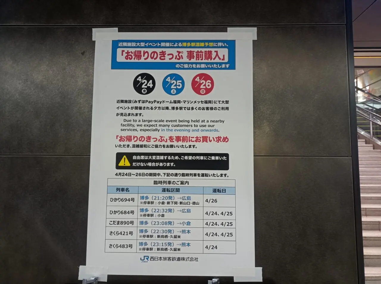 以前、JR九州と西日本は臨時列車の運転を発表していましたが、さらに4月26日のライブ終了に合わせて増やしています。詳しくはこちらからご確認ください。