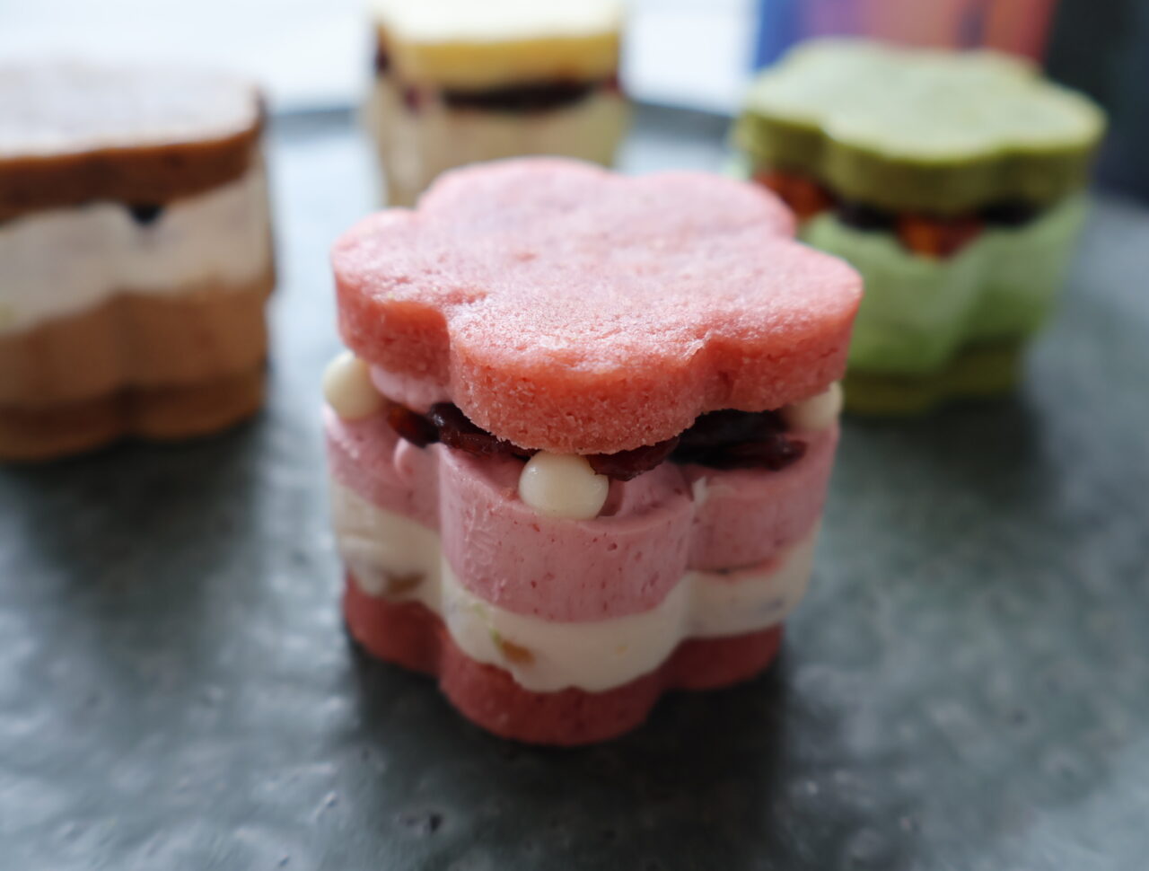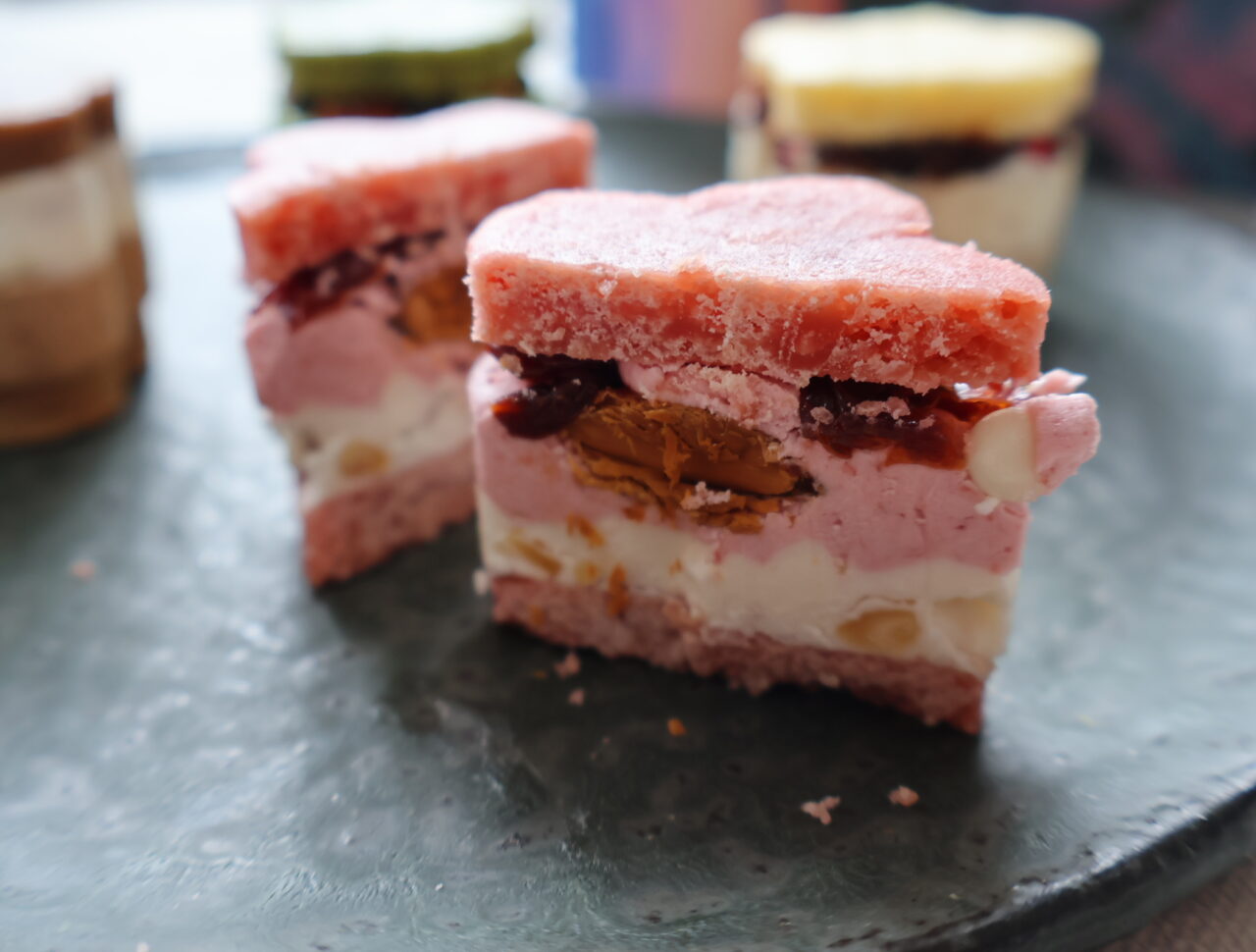 様々な食べ方ができるのも魅力のひとつ。冷凍庫から出してすぐ食べればアイスクリームのように味わうことができます。また、解凍してから食べると、クリームの柔らかい食感や素材の香りを楽しむことができます。ひとつで三度美味しい!まさに五感で楽しむバターサンドです。
